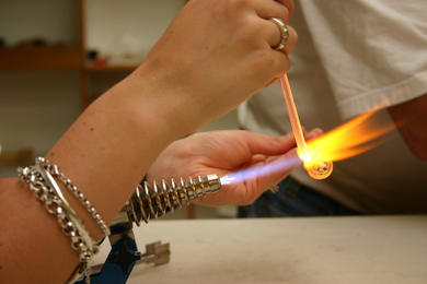 The art of beadmaking by winding molten glass around a steel mandrel is often referred to as “Lampworking”. The early glass bead makers in Venice used oil lamps as their heat source for melting the glass. Today, we use a torch that uses a mix of propane as the fuel and oxygen as an accelerant, to get a precise flame that controls the heat in the glass as it melts. At our studio we offer members of the public the opportunity to try their hands at beadmaking. These classes are the perfect introduction with lots of fun! No previous experience is necessary, and each participant will enjoy the easy step-by-step learning process. These popular classes are for beginners with little or no experience with glass. It is an excellent opportunity for both individuals and ‘team building’ groups to try this creative process. Demonstrations and ‘hands-on’ experience will introduce basic glassmaking techniques. Small class size allows for maximum interaction, creating a friendly and relaxed atmosphere.