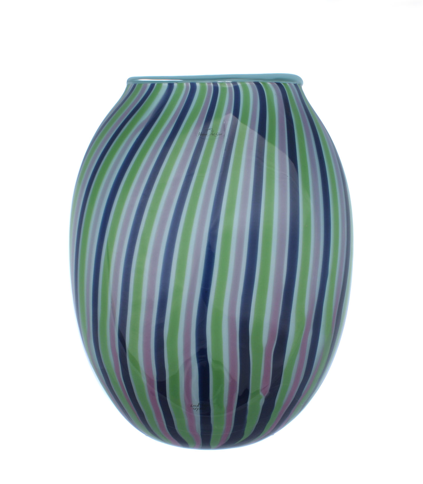 The intricate blowing technique to create this stunning Cane vase uses handmade coloured, glass canes fused into the molten crystal clear glass from the glass furnace. Ola Höglund is well known for the use of bold colour combinations.