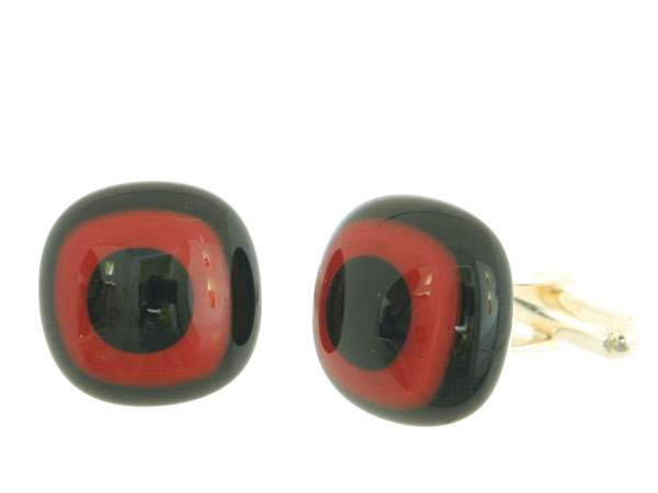 The Cufflinks have been individually made by hand. Several pieces of handmade glass are stacked and placed into a kiln and fused together at high temperatures as high as 815º C (1500º F). It is then allowed to cool slowly over a specified time, soaking at specified temperature ranges which are essential to the annealing process. This takes place normally for a period of 10-12 hours in 3 stages. The exact combinations of glass, temperature and placement within the kiln create a different result each time.