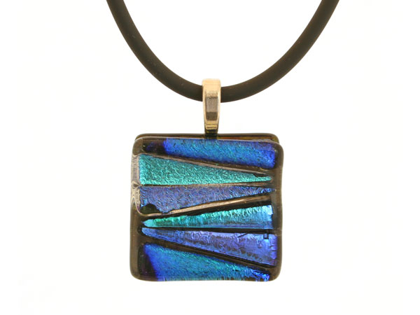 One-of-a-kind Dichroic Glass Pendant on 18″ black rubber cord with sterling silver latch.