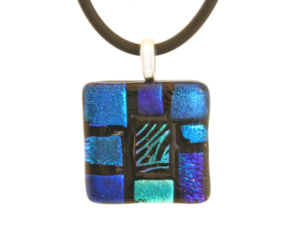 One-of-a-kind Dichroic Glass Pendant on 18″ black rubber cord with sterling silver latch.