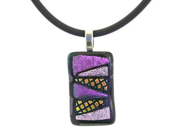 One-of-a-kind Dichroic Glass Pendant on 18″ black rubber cord with sterling silver latch.