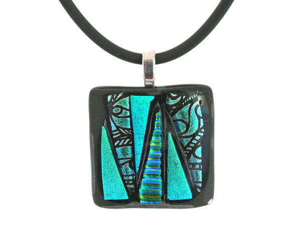 One-of-a-kind Dichroic Glass Pendant on 18″ black rubber cord with sterling silver latch.