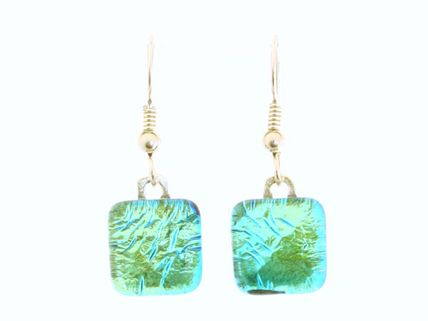 This pair of earrings have been individually made by hand. Several pieces of handmade glass are stacked and placed into a kiln and fused together at high temperatures as high as 815º C (1500º F). It is then allowed to cool slowly over a specified time, soaking at specified temperature ranges which are essential to the annealing process. This takes place normally for a period of 10-12 hours in 3 stages. The exact combinations of glass, temperature and placement within the kiln create a different result each time.