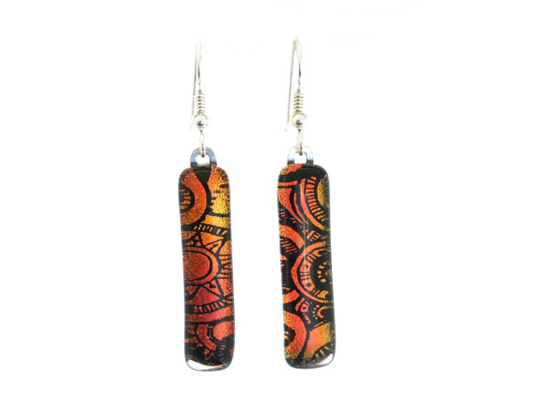 This pair of earrings have been individually made by hand. Several pieces of handmade glass are stacked and placed into a kiln and fused together at high temperatures as high as 815º C (1500º F). It is then allowed to cool slowly over a specified time, soaking at specified temperature ranges which are essential to the annealing process. This takes place normally for a period of 10-12 hours in 3 stages. The exact combinations of glass, temperature and placement within the kiln create a different result each time.
