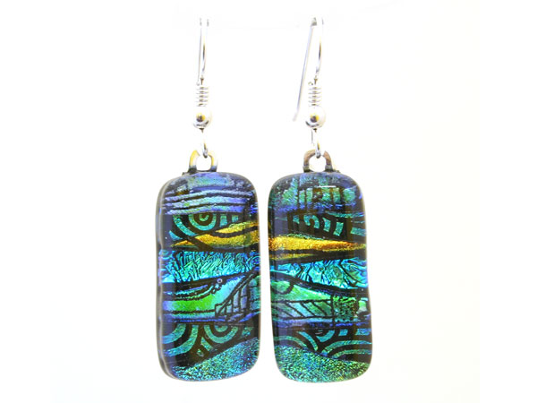 This pair of earrings have been individually made by hand. Several pieces of handmade glass are stacked and placed into a kiln and fused together at high temperatures as high as 815º C (1500º F). It is then allowed to cool slowly over a specified time, soaking at specified temperature ranges which are essential to the annealing process. This takes place normally for a period of 10-12 hours in 3 stages. The exact combinations of glass, temperature and placement within the kiln create a different result each time.