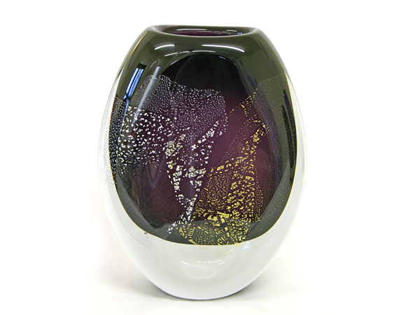 Deep purple colour combined with crystal clear glass with fine silver and 24 karat gold in an elegant and pure design. This vase is one-of-a-kind and totally unique.
