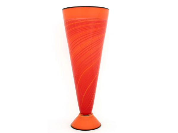 Each Flute vase is individual, and unable to be repeated – “even if I tried I wouldn’t be able to duplicate them’ – this makes each one unique and each differs due to the techniques used, flow of the colours and the handmade canes. The vases are presented in a wide range of colour combinations from blues and greens through to orange, red and bright lime green.