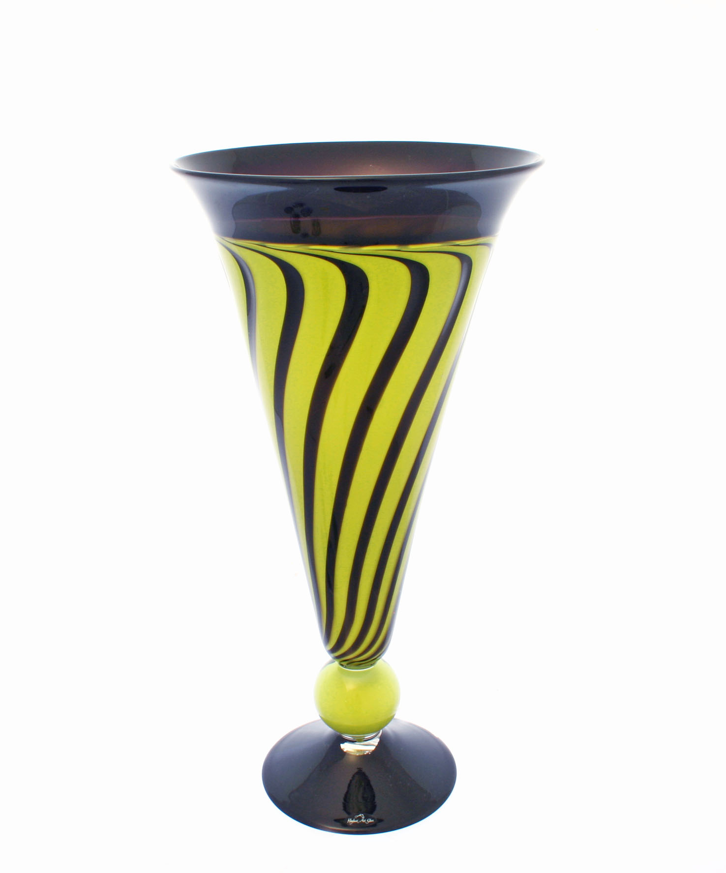 The intricate blowing technique to create these stunning Incalmo Chanterelle Vases uses handmade coloured, glass canes fused into the molten, lead-free crystal glass from the glassblowing furnace. Ola Höglund is well known for his use of bold colour combinations. A technique that shows off these colour combinations in style, is the Incalmo Technique – it demands several blown bubbles of glass – one for the body, one for the base and one for the attached rim. At a particular time, when the bubbles have been worked to the desired size, the four bubbles are joined while still hot. Once cooled in the annealing kiln, you can feel where the four bubbles were joined together.