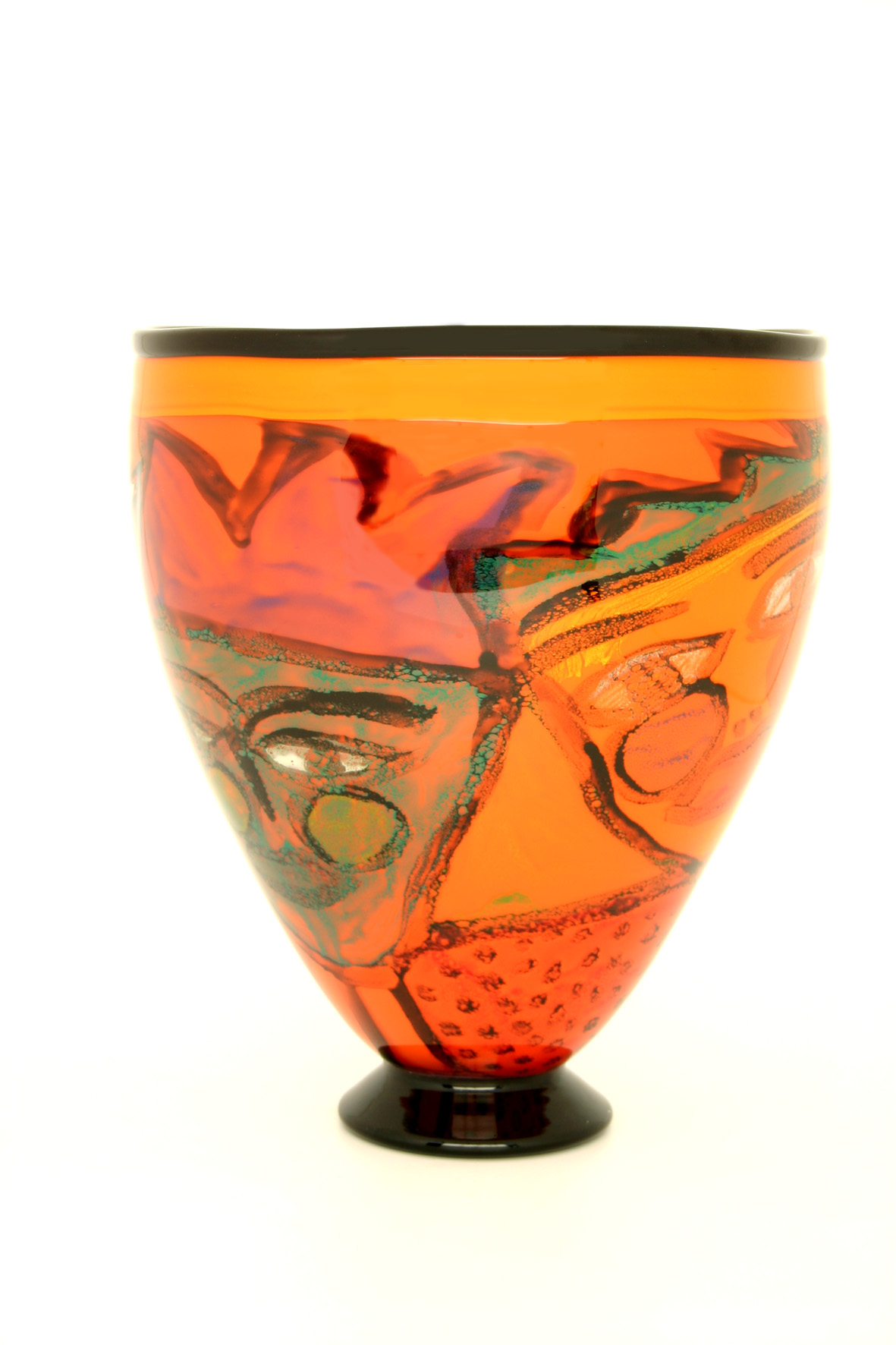 Marie paints the image with crushed, coloured glass on a small bubble – often as small as an egg. Ola reheats the bubble, and it is re-attached to the blowpipe, before being overlaid with several more layers of crystal clear glass. He then blows the vessel into its final and enlarged size, stretching and expanding Marie’s painted image as he blows. Great skill and artistic sensitivity are required throughout this operation. A complex Graal piece may take several weeks to create. The beauty of the Graal technique is reflected in the decoration, it becomes a three-dimensional, exquisite piece of artwork.