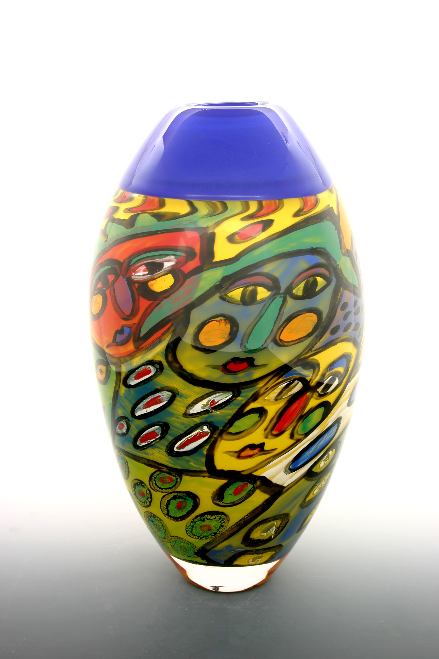 Marie paints the image with crushed, coloured glass on a small bubble – often as small as an egg. Ola reheats the bubble, and it is re-attached to the blowpipe, before being overlaid with several more layers of crystal clear glass. He then blows the vessel into its final and enlarged size, stretching and expanding Marie’s painted image as he blows. Great skill and artistic sensitivity are required throughout this operation. A complex Graal piece may take several weeks to create. The beauty of the Graal technique is reflected in the decoration, it becomes a three-dimensional, exquisite piece of artwork.