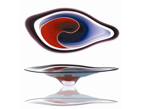 Glass artists Ola Höglund & Marie Simberg-Höglund are well known for their use of bold colour combinations. The Incalmo technique was developed in Venice approx. 500 years ago and has traditionally been used to create horizontal bands of colour in blown glass. The technique demands the glassblower to blow individual bubbles of coloured or cleared glass which, at a particular time, when the bubbles have been worked to the desired size, the bubbles are joined while still hot. Once the platter has cooled in the annealing kiln, you can feel where the bubbles were joined together. Incalmo is a technically complex and physically demanding technique to use. An artist must be a proficient glassblower and dedicated to the process in order to master it. Ola Höglund has adapted the reverse Incalmo technique to create vertical and diagonal bands of colour in his work. His innovative use of a traditional process results in designs that are quite unique. With the addition of vibrant colours, the artist creates a body of work with strong visual impact.