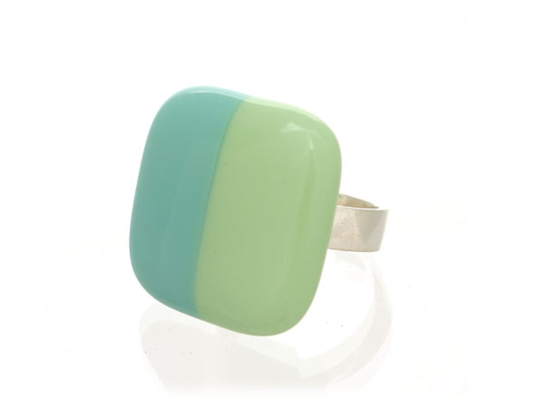 This ring has been individually made by hand. Several pieces of handmade glass are stacked and placed into a kiln and fused together at high temperatures as high as 815º C (1500º F). It is then allowed to cool slowly over a specified time, soaking at specified temperature ranges which are essential to the annealing process. This takes place normally for a period of 10-12 hours in 3 stages. The exact combinations of glass, temperature and placement within the kiln create a different result each time.