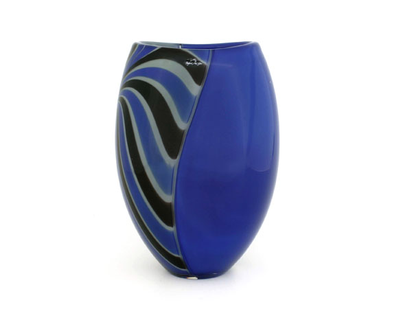 This vase is made in a variation of the technique, known as reverse Incalmo. It involves piercing a hole on the side of the assembled bubbles and attaching them to another blow pipe. The glassblower then gathers more glass and forms the piece into the desired shape. Incalmo is a technically complex and physically demanding technique to use. An artist must be a proficient glassblower and dedicated to the process in order to master it. Ola Höglund has adapted the reverse Incalmo technique to create vertical and diagonal bands of colour in his work. His innovative use of a traditional process results in designs that are unique.
