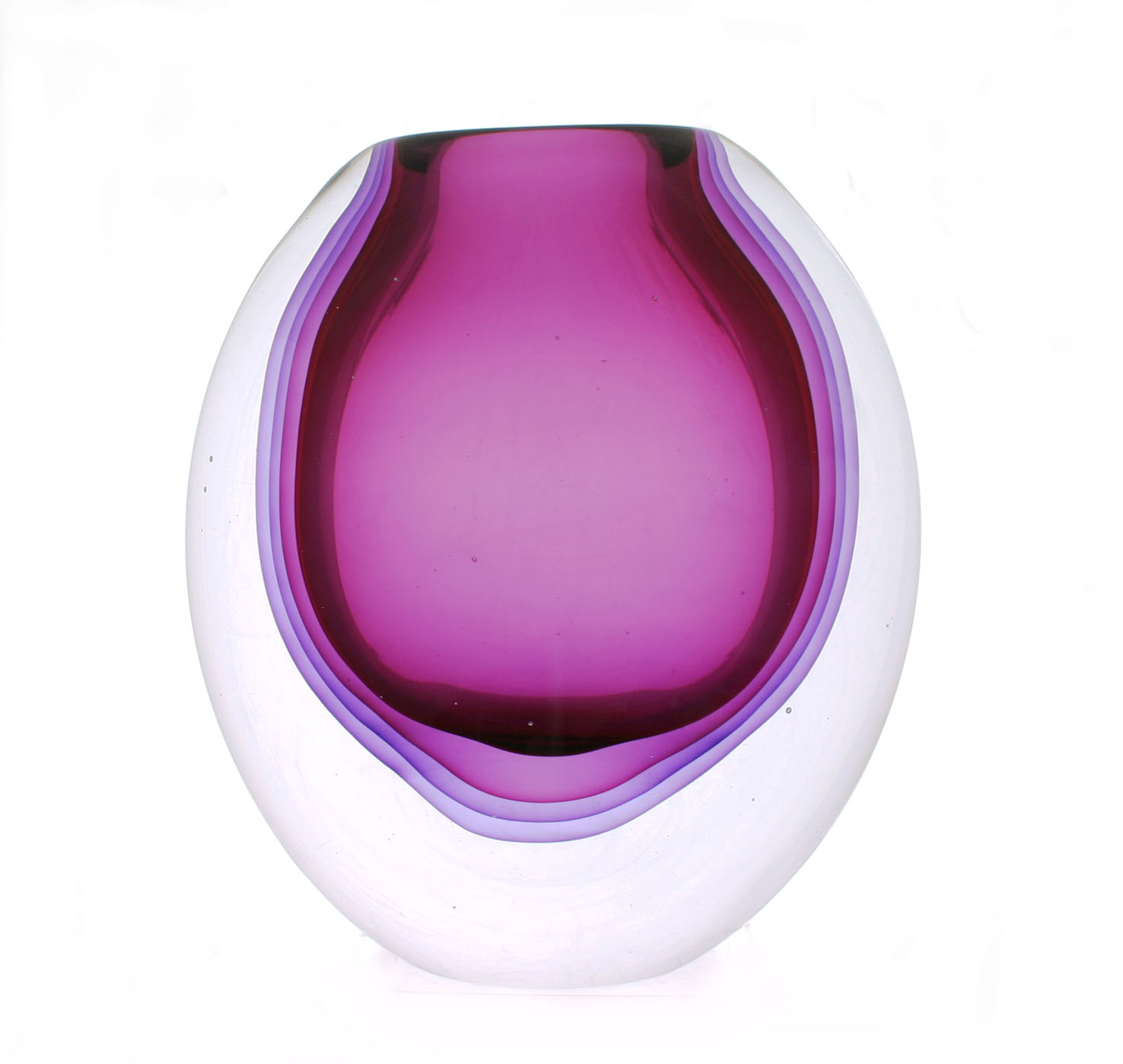 In the center, delicate layers of coloured glass are worked around the core, submerged within layer upon layer of crystal glass.